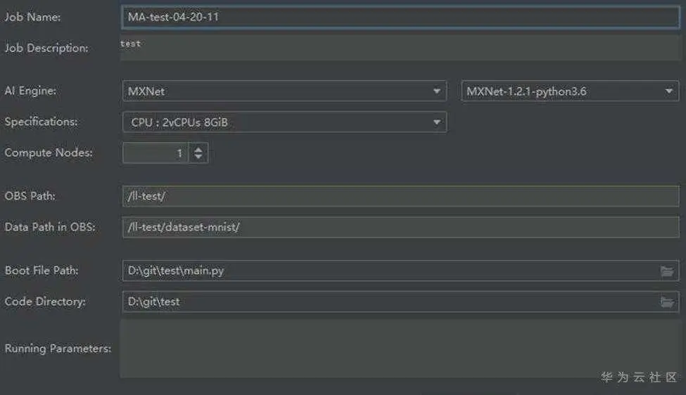 填写参数,可以参考ModelArts训练模型时填写的参数: