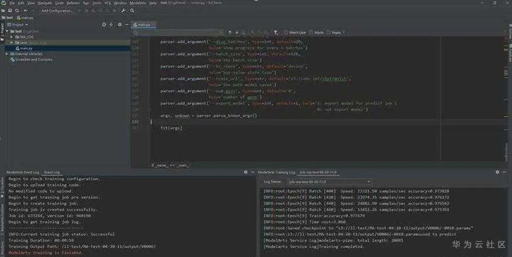 除了本地IDE工具功能以外,PyCharm能不能做得更好?我觉得就PyCharm自身来看,发展已经上了正规,我认为目前应该做的是生态的扩展,或者说联合。与谁联合?与公有云。如果能够做到在本地编码、利用公有云的计算资源进行调试,那相当于做到了云边协同。华为云ModelArts提供了插件,支持让本地的PyCharm与ModelArts结合在一起使用(详细的过程请参考文档:bbs.huaweicloud.com/blogs/16046…)。
