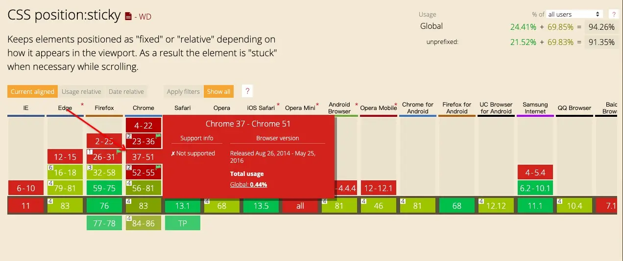如上图所示,position的sticky已经被各类游览器支持,并且得到了比较好的支持,除safari还需-webkit-前缀支持外。