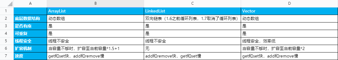 java中list是很常见的数据类型,它是有序的集合,它有三个实现类,分别是ArrayList、LinkedList、Vector。它们三者有啥区别,我们可以直接看如下表格: