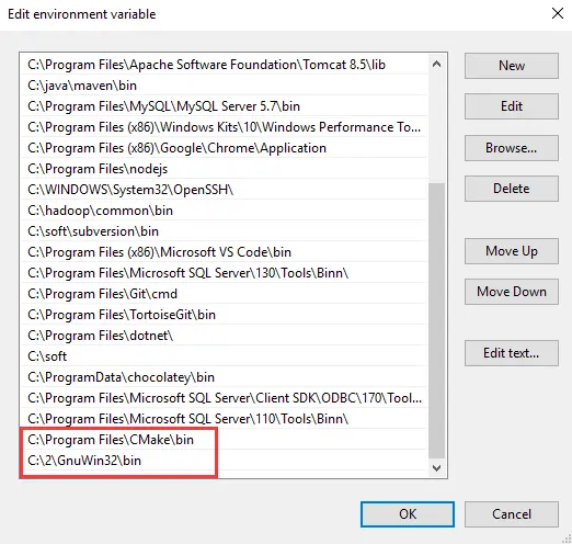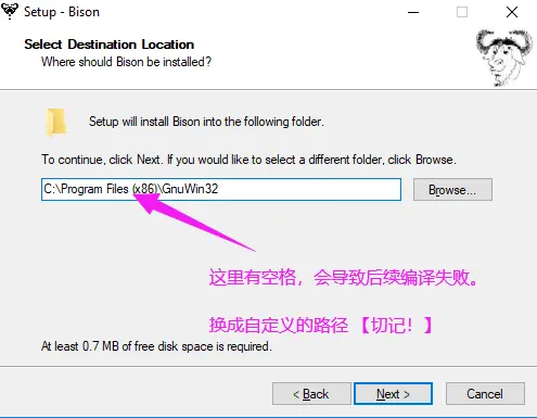 cmake 和 bison 安装起来比较方便,一键安装就可以了,不过这里有一个大坑注意了,在安装Bison的时候,千万不要使用默认路径,因为默认路径有空格,会导致你后面vs编译的时候卡住,又不显示什么原因,可气!!! 所以我换成自定义的: C:\2\GnuWin32。