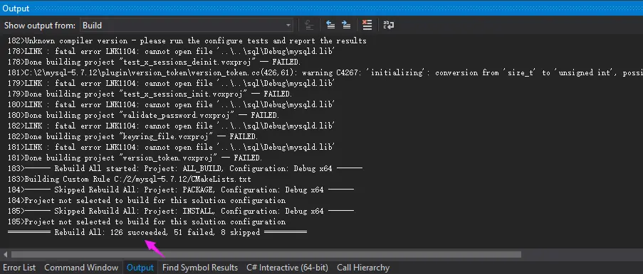 我的电脑安装的是visual studio 2019,接下来打开MySql.Sln整体编译,需要等个十几分钟,看到下面的输出就算安装成功。