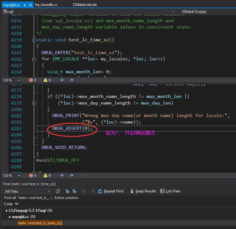 修改C:\2\mysql-5.7.12\sql\mysqld.cc中的 test_lc_time_sz方法中的 DBUG_ASSERT(0); 改成 DBUG_ASSERT(1); 如下图: