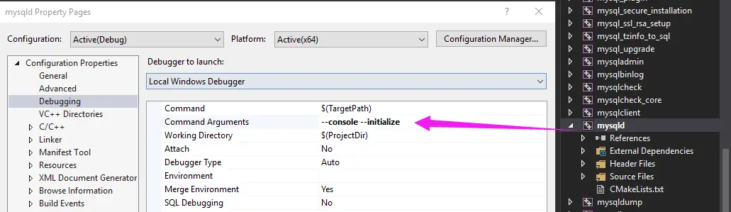 上一篇大家都知道了,mysqld项目是mysql的启动项目,main函数也在其中,在F5调试之前增加初始化参数 --console --initialize,如下图: