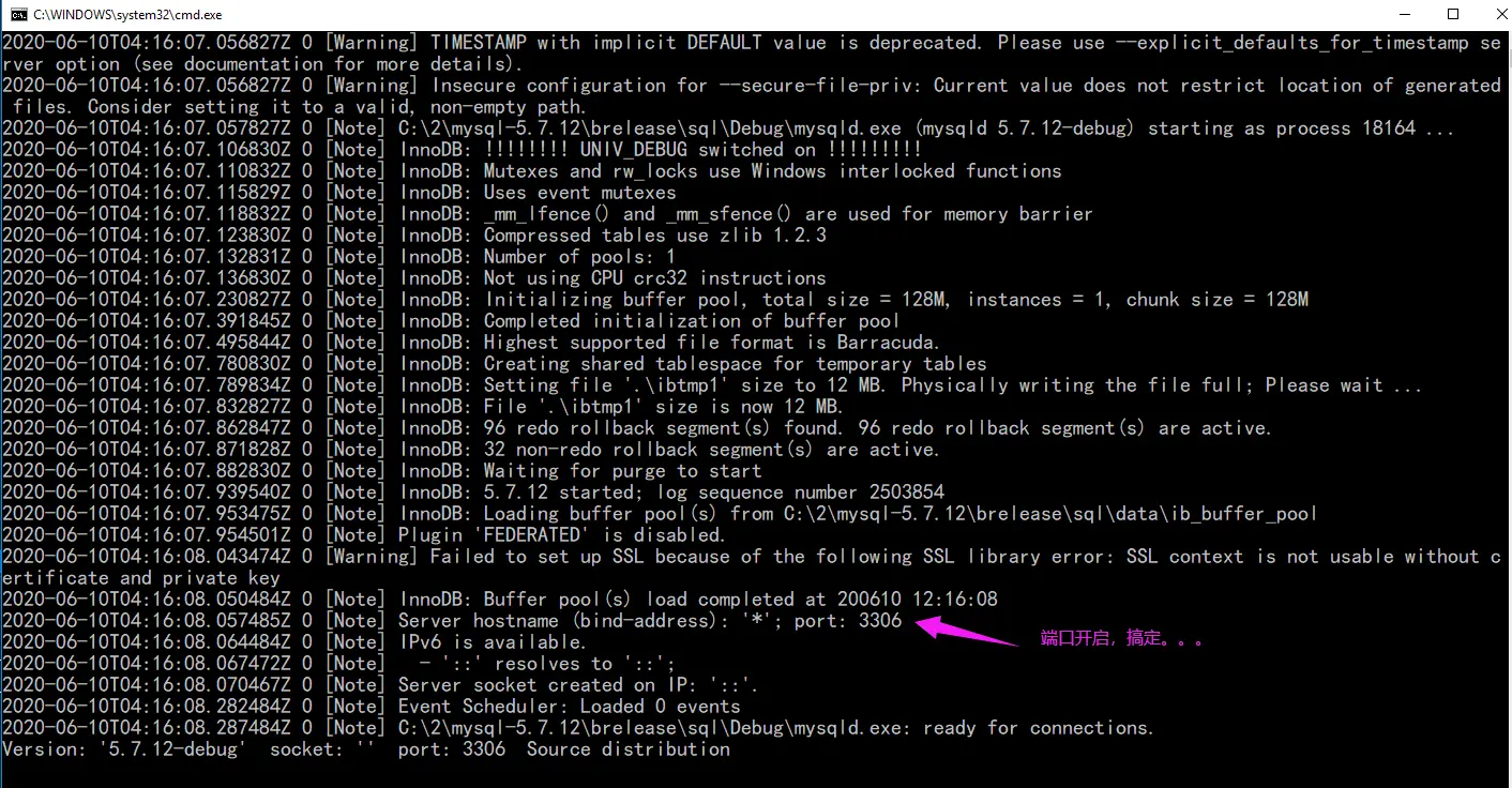 这里要做两件事情,第一件事是将mysql的调试模式打开,第二件事就是附加 --initialize 启动参数。