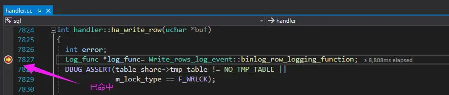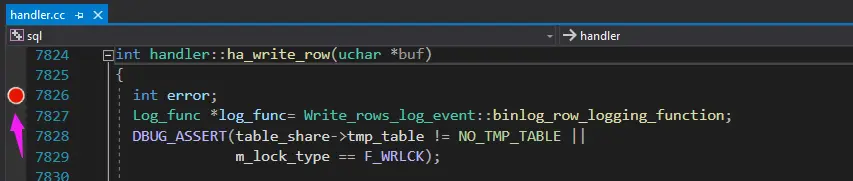 接下来,大家看仔细了,在源码 int handler::ha_write_row(uchar *buf) 方法处下一个断点,然后F5调试应用程序。