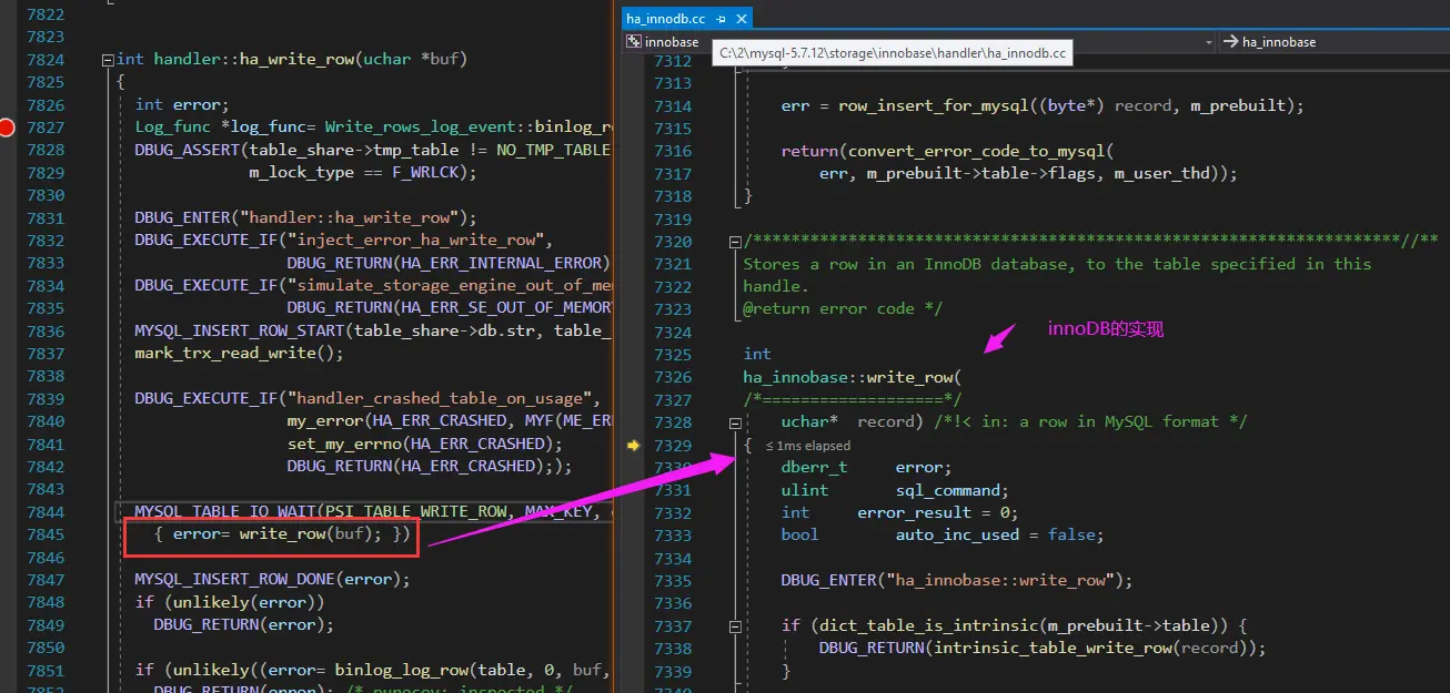 可以看到,断点命中了,然后进行单步调试,最终你会看到代码会进入到 C:\2\mysql-5.7.12\storage\innobase\handler\ha_innodb.cc中的 int ha_innobase::write_row 方法,如下图: