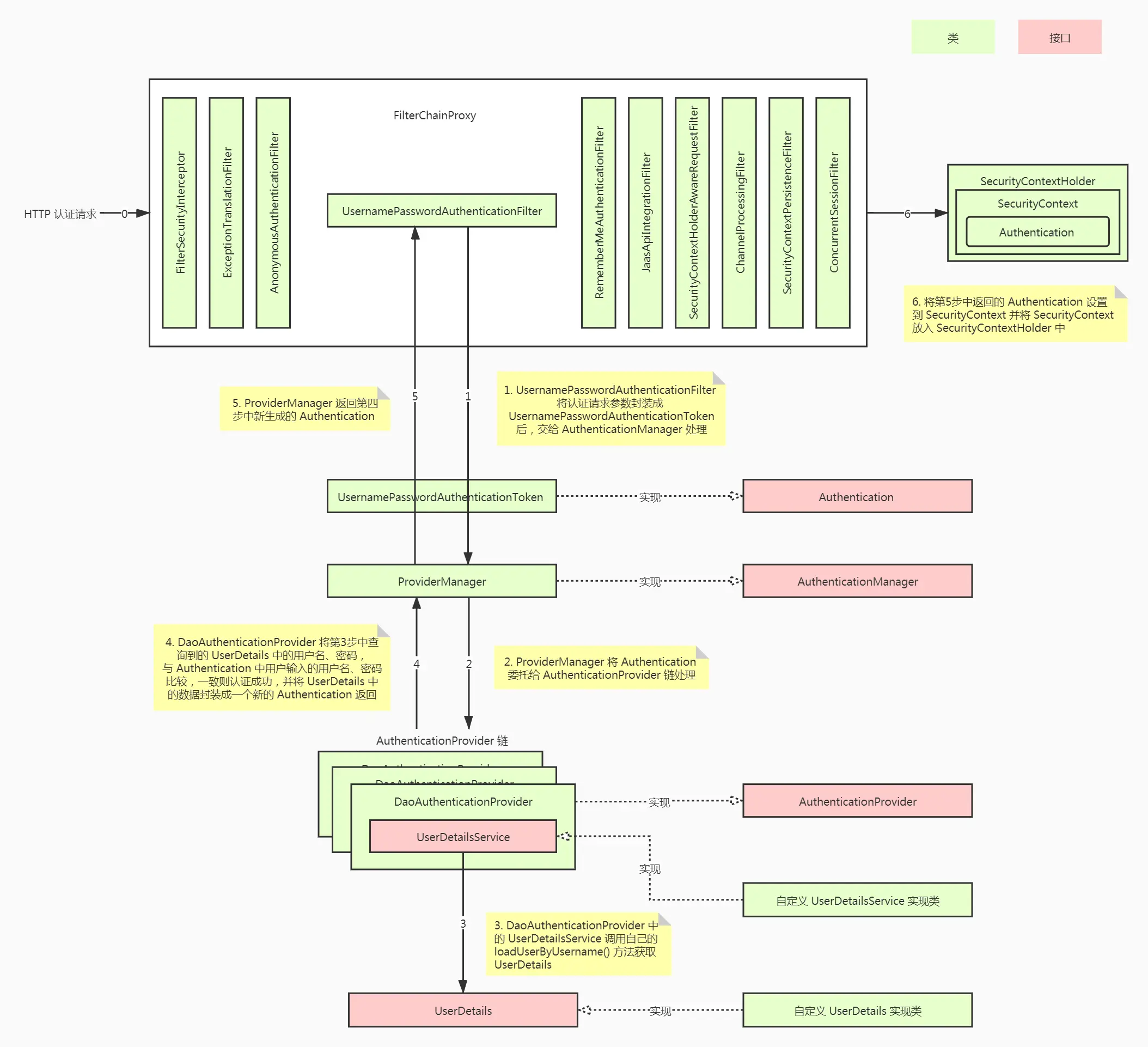 FilterChainProxy过滤器链,被某个过滤器(比如:UsernamePasswordAuthenticationFilter)封装成Authentication(类型上面的登陆对象) AuthenticationManager的实现类ProviderManager将Authentication委托给AuthenticationProvider链处理。AuthenticationProvider链中的某一个AuthenticationProvider(比如: DaoAuthenticationProvider) 将使用内部属性 ——UserDetailsService对象调用自己的loadUserByUsername()方法获取UserDetails(相当于上面的数据库中的用户)AuthenticationProvider将第3步中查询到的UserDetails中的认证信息,与 Authentication 中用户输入的认证信息比较,一致则认证成功AuthenticationProvider将UserDetails中的数据封装成一个新的Authentication返回。- 将返回的