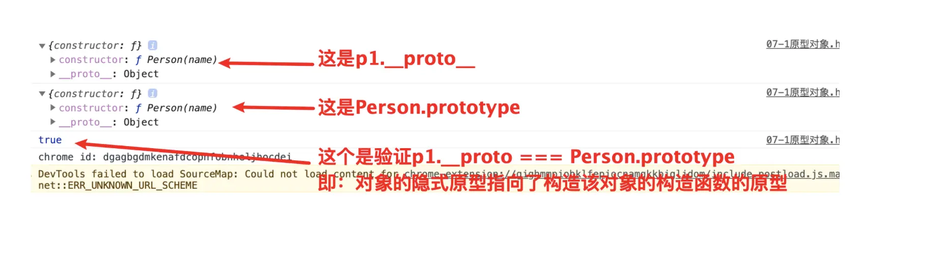 console.log(p1.__proto__ === Person.prototype) // 一个对象的隐式原型是否指向构造该对象的构造函数的原型