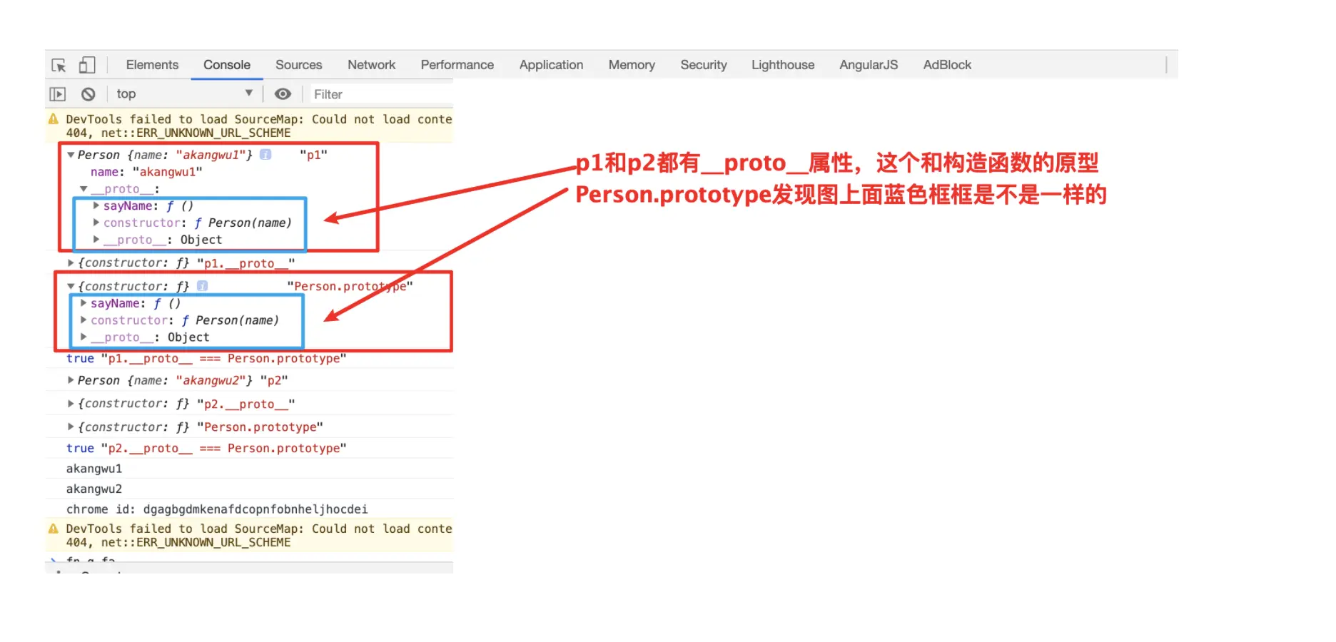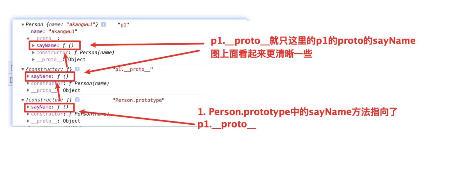 Person.prototype.sayName = function() { // 我们这里通过原型在构造函数Person的原型上添加了一个sayName的方法,我们通过p1调用,会直接输出 akangwu