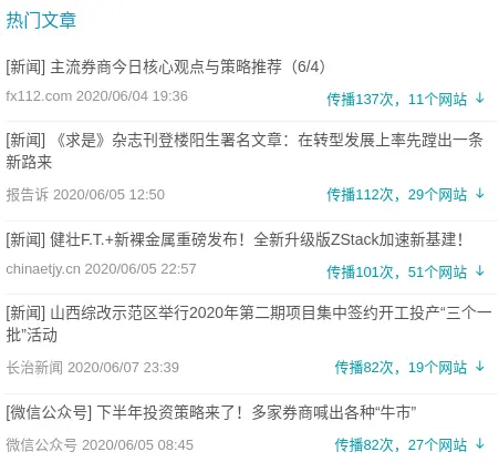 中国基金报3日发布的《券商下半年投资策略》在27家网站传播了82次,排在榜单末位。文章指出,近日多家券商举行了中期策略会,发布了下半年A股策略报告,总体看,大多卖方对下半年市场偏乐观,甚至有人认为,“类牛市”可期。