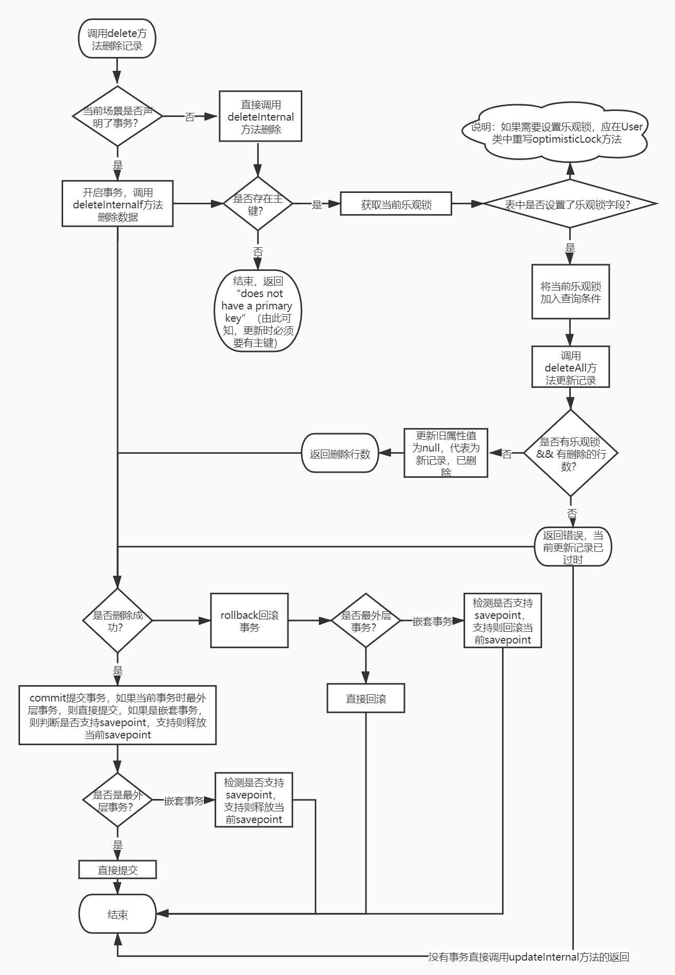 下图为Yii2框架的ActiveRecord删除语句源码基本逻辑:(基本和更新的逻辑差不多)