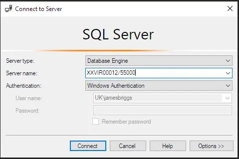 在“Connect to Server”对话框或者MS SQL Server Management Studio的视窗顶端可以找到服务器的名称: