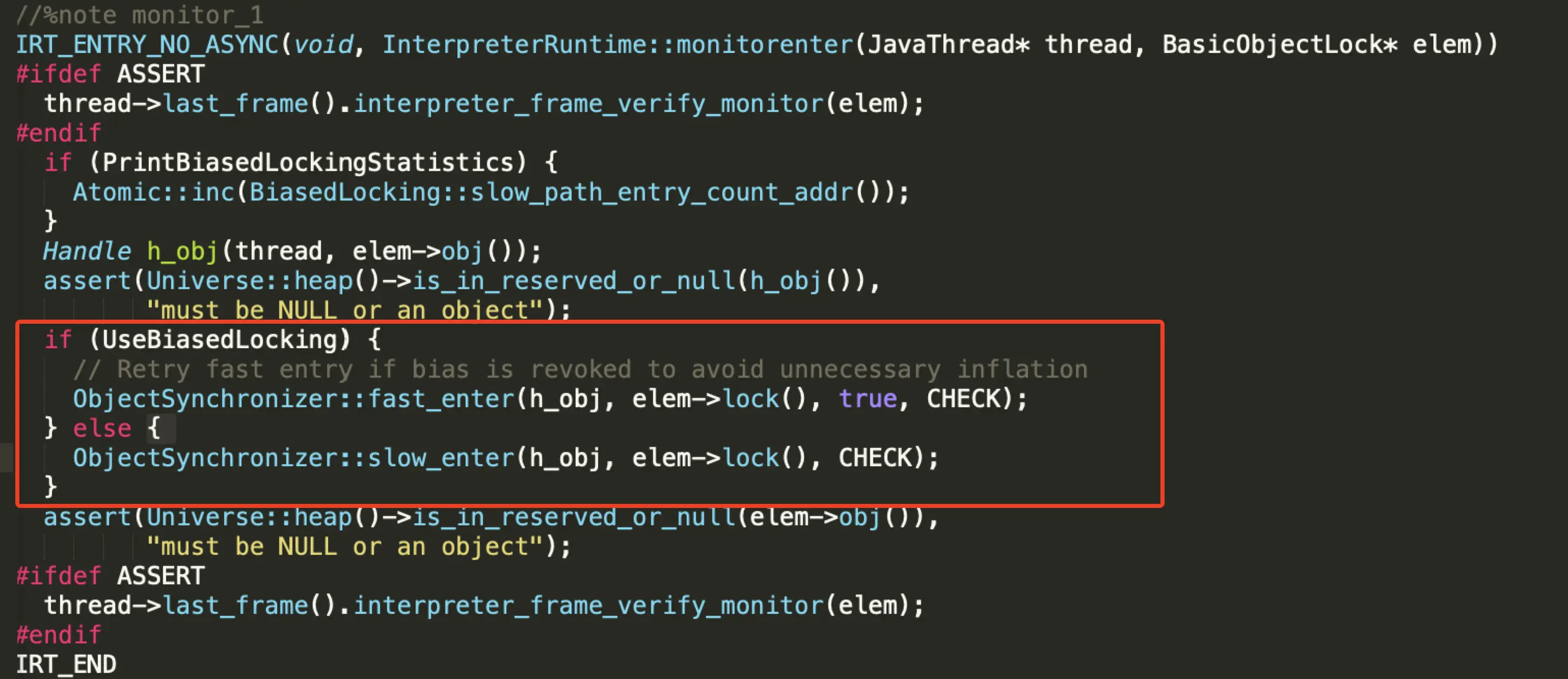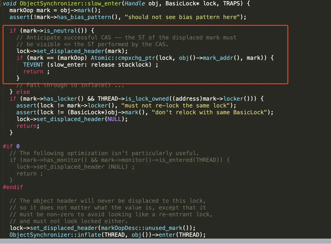 当关闭偏向锁功能,或多个线程竞争偏向锁导致偏向锁升级为轻量级锁,会尝试获取轻量级锁,其入口位于ObjectSynchronizer::slow_enter
