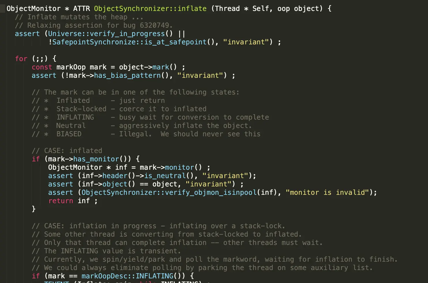 当锁膨胀完成并返回对应的monitor时,并不表示该线程竞争到了锁,真正的锁竞争发生在ObjectMonitor::enter方法中。
