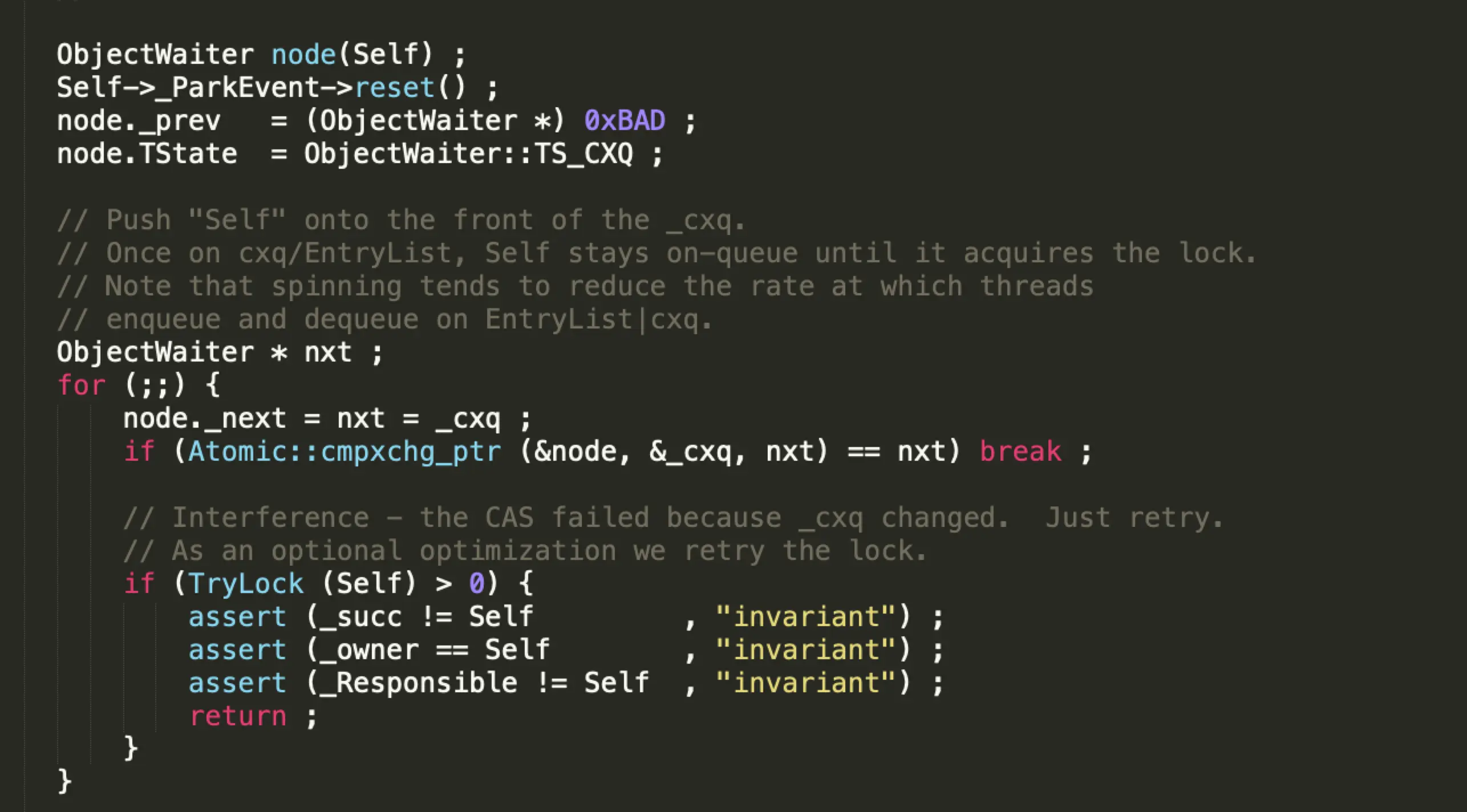 - 1、当前线程被封装成ObjectWaiter对象node,状态设置成ObjectWaiter::TS_CXQ;