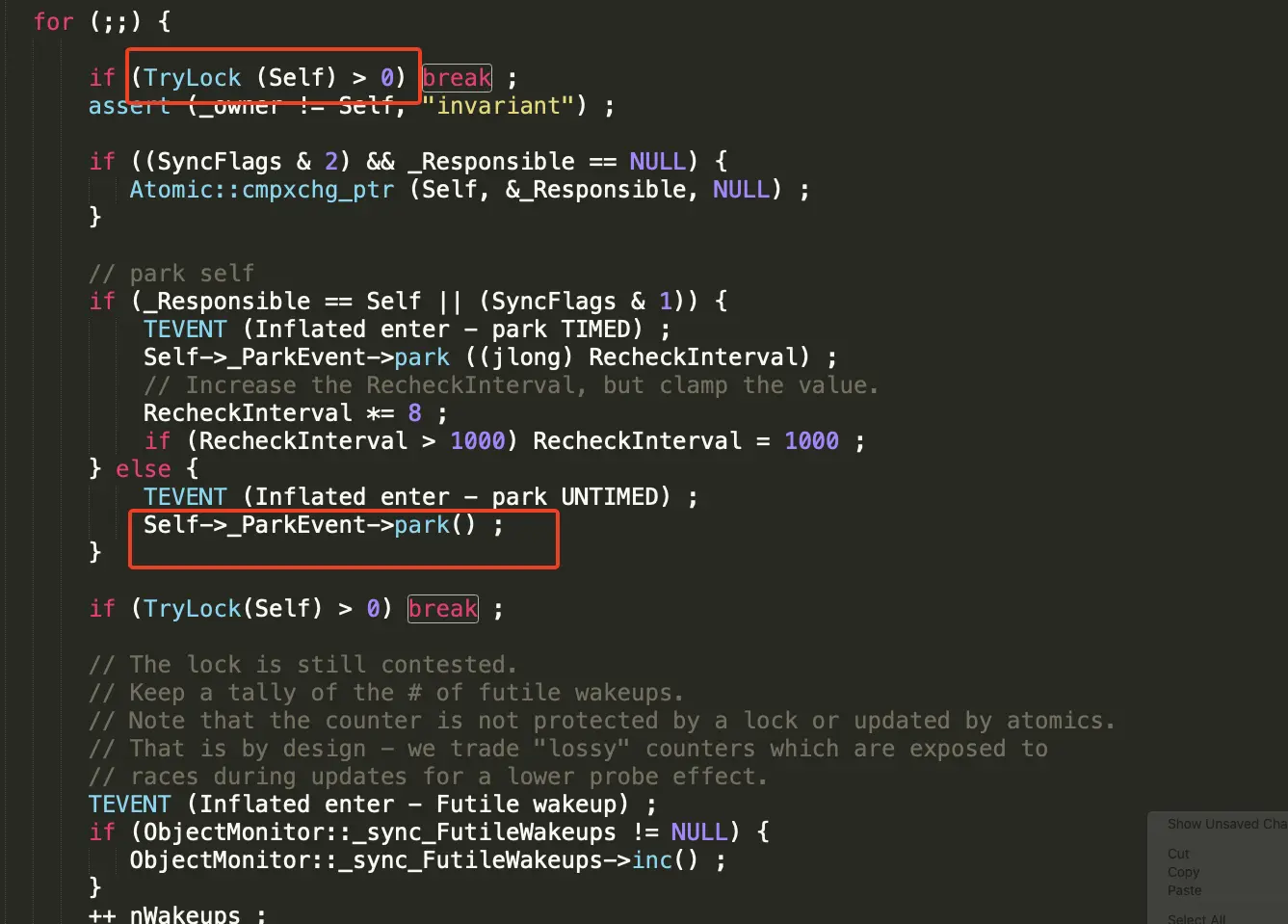 - 3、node节点push到_cxq列表之后,通过自旋尝试获取锁,如果还是没有获取到锁,则通过park将当前线程挂起,等待被唤醒,代码如下: