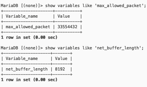 max_allowed_packet和net_buffer_length两个参数是用来加速的,可以查看从库数据 - 如果 root 有密码请加上参数例如
