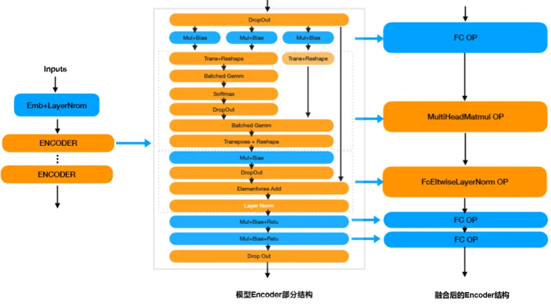 融合后的Encoder结构:Paddle Inference将编码部分融合成了由FC、MultiHeadMatmul、FcEltwiseLayerNorm等算子组成的结构。