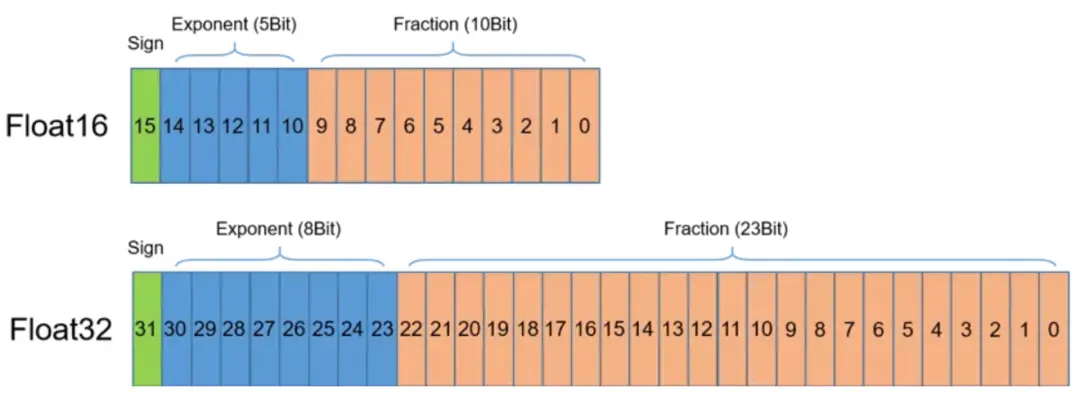 Float32对于我们非常熟悉了,那Float16(又称为半精度浮点数)是什么呢?如下图所示,Float16是一种相对较新的浮点类型,在计算机中使用 2 字节(16 位)存储,在 IEEE 754-2008 中,它被称作 binary16。
