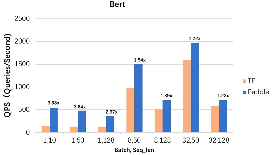 同时我们在Bert模型(该模型的预测结构同ERNIE整体上比较接近)下同Tensorflow在T4卡上进行了性能对比(针对每种测试情况我们选取了TF,TF-XLA,TF-TRT FP16中的最佳性能)。从下图中可以看到,在batch和seq_len较小的时候,飞桨的单位时间吞吐量为TensorFlow的2-4倍,即使在batch和seq_len较大时(32, 128),飞桨的性能也比TensorFlow快20%-30%。