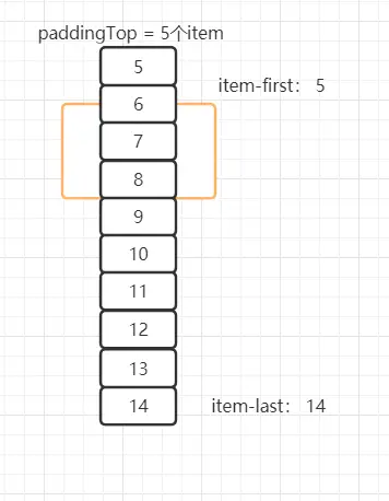 - 那么对应的 paddingTop 的高度就是 这个首item索引前面所有元素的高度总和(比如在上图中首item索引为5的时候,paddingTop 为5个item的高度, 5 x 150 = 750)