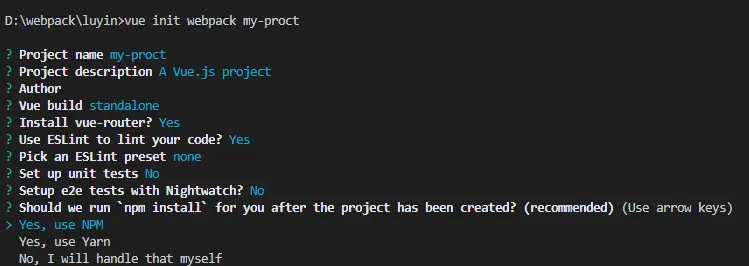 基于webpack创建vue项目 草莓千层蛋糕 2020-06-11 232 阅读1分钟 node -v npm -v npm install vue-cli -g vue -V npm install webpack webpack-cli -g vue init webpack mysite(其中webpack是模板名称) cd my-proct npm run dev