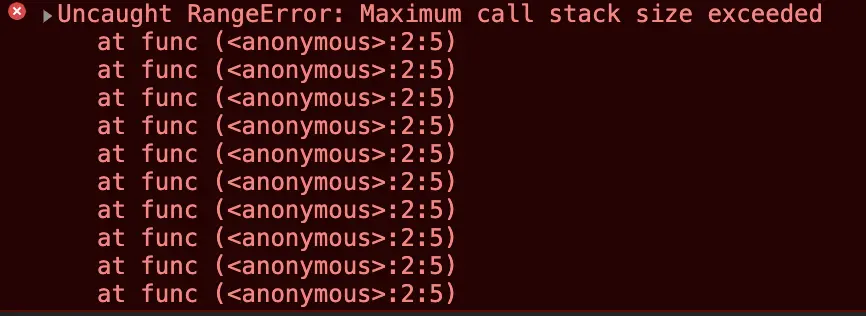 只有入栈而没有出栈,直到调用栈中的执行上下文达到最大数量,就会报错结束。