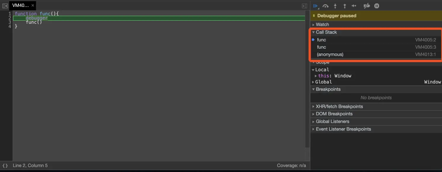 跳过一次断点后,可以明显的看出调用栈的变化。