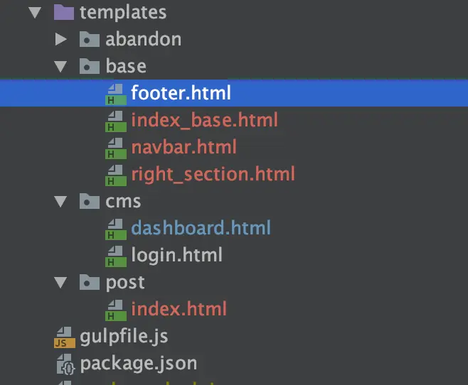 这里我们把index.html拆开成了footer.html, index_base.html, navbar.html 和 right_section.html四部分,主要结构就是在index_base.html里面: