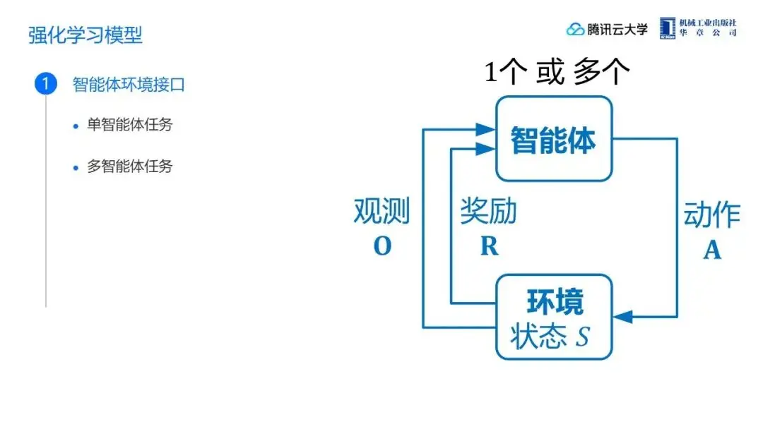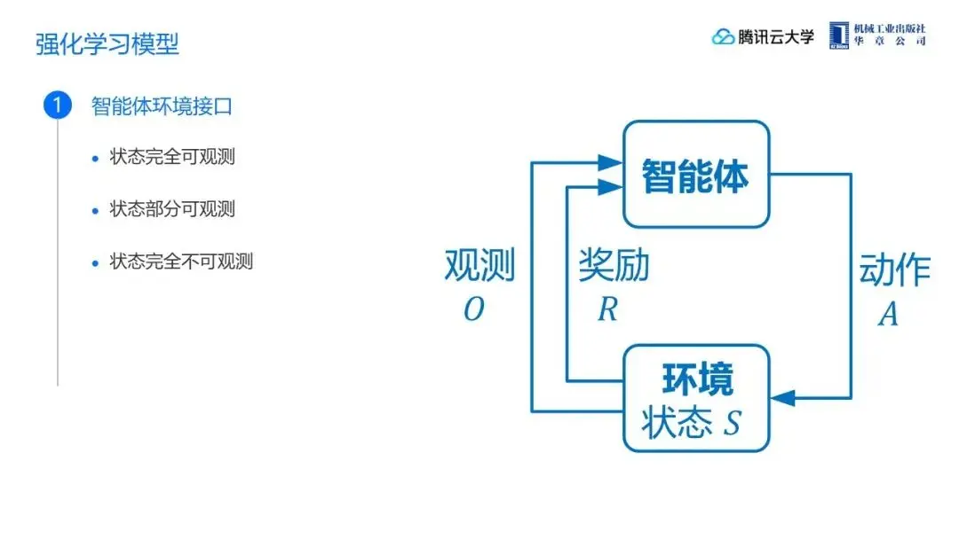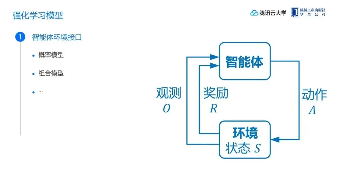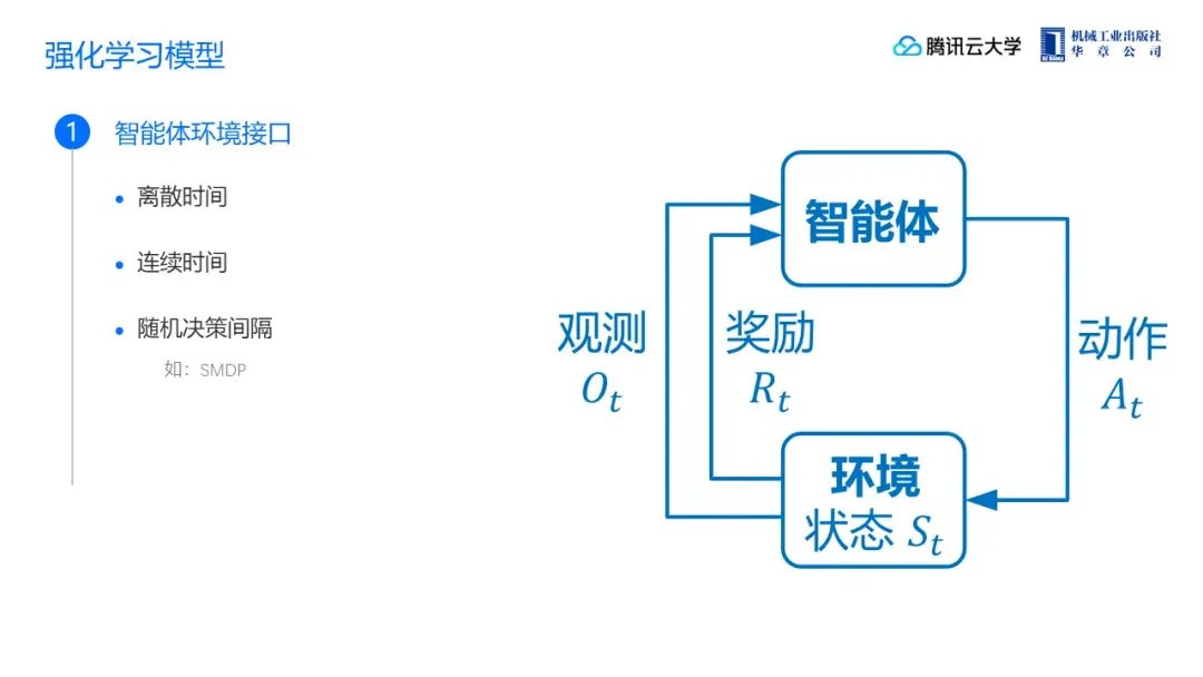 强化学习最著名的模型就是智能体环境接口。该接口决策和学习的部分与其他部分分离,决策和学习的部分归为智能体,其他的部分都归为环境。举刚才写论文的例子,在写论文的例子中,我学习怎么写论文,或是决定要怎么写,这些都是属于智能体部分,但是我并不是智能体,也有很多部分是属于环境的。比如我今天生病了,就不写论文了,那我的健康状况是属于环境。智能体环境接口的核心思想在于把主观可以控制的部分和客观不能改变的部分分开,分开以后,只需要通过三个要素,在这两部分之间进行交互,这三个要素是动作、观测和奖励。刚刚说奖励可以是惩罚,奖励和惩罚是等价的。但是动作和观测不一定是数值的。观测可以是看到了帅气的小哥哥或是漂亮的小姐姐,这样的观测。动作可以是向前向小哥哥或小姐姐要微信。这就是自然体环境接口。
