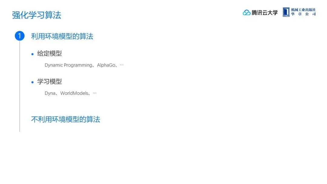 无论环境是不是概率的,我们可以选择是不是对环境进行建模。强化学习算法,根据算法过程是否对环境建模,可以分为利用环境模型的算法和不利用环境模型的算法。利用环境模型的算法还可以进一步分类,怎么在有些问题中环境我是给定的,比如像动态规划、阿法狗就是这样的算法。那我们直接用给定的环境模型就好了,这类都是给定环境模型的算法。那么还有一些问题,环境模型事先不知道,需要智能体通过观测或数据不断学习,比如说像Dyna算法和WorldModels算法都是需要学习模型的算法。