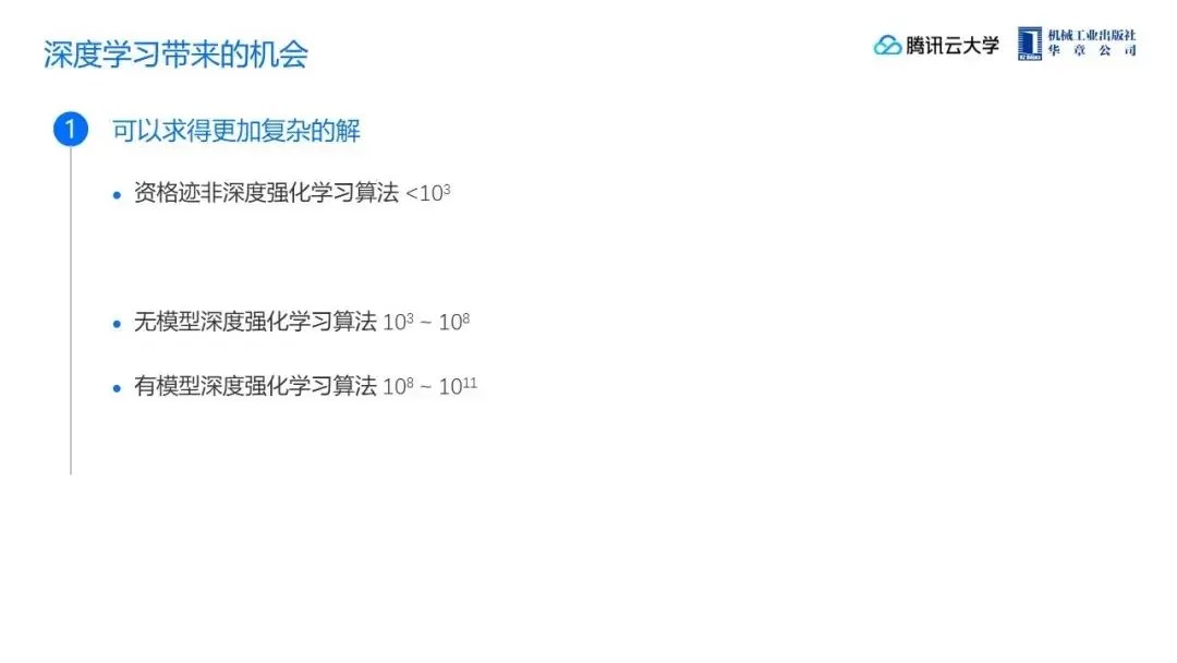 深度强化学习算法为什么常常能够比非深度强化学习算法更厉害呢,这是因为用了深度学习的强化学习方法可以求得更加复杂的解,能在更加困难的问题上得到更好的性能。那么使用非深度强化学习算法时,能够求解的问题都解的参数往往就是在几千个参数这个量级。如果我们用无模型的深度强化学习算法能够求解的问题的解的参数量级在几千个到几千万个参数的两级。如果我们用有模型的深度强化学习算法能够求解的问题的解的参数量级是几千万个、几亿个甚至几十亿个的量级。所以不同参数量级的问题,我们就往往使用它最适合的算法,而深度学习能够胜任更大量级的参数,解决更加复杂的问题。深度强化学习算法的很多思想都是来自于那些没有利用深度学习的经典算法,学习深度学习强化算法还是非常有意义的。