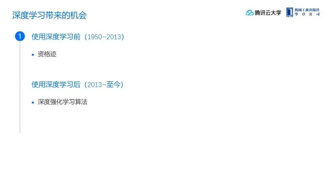 最近几年的强化学习非常的热门,出现了一些脍炙人口的应用,他们都是深度学习和强化学习强强联合的产物,无论是基于价值的强化数据算法,还是基于策略梯度的强化学习算法,都可以脱离于深度学习存在。从1950年到2013年这么长的时间里出现过了很多很多的强化学习算法,基本都和深度学习没关系,但是他们已经能够完成很多很多的工作了,比如说其中的资格迹算法,可以说是强化学习的一个旗舰算法,在很多问题中已经有很好的表现。2013年,深度学习和强化学习结合起来,结合成了的深度强化学习算法。那么深度强化学习算法诞生以后,在强化训练领域马上就有突飞猛进的发展,解决问题的困难程度大大超过之前的非深度强化算法。