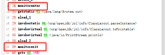 方法的同步并没有通过指令monitorenter和monitorexit来完成(理论上其实也可以通过这两条指令来实现),不过相对于普通方法,其常量池中多了ACC_SYNCHRONIZED标示符。JVM就是根据该标示符来实现方法的同步的:当方法调用时,调用指令将会检查方法的 ACC_SYNCHRONIZED 访问标志是否被设置,如果设置了,执行线程将先获取monitor,获取成功之后才能执行方法体,方法执行完后再释放monitor。在方法执行期间,其他任何线程都无法再获得同一个monitor对象。 其实本质上没有区别,只是方法的同步是一种隐式的方式来实现,无需通过字节码来完成。