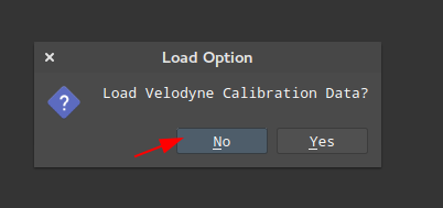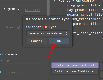 选择标定类型为相机到 velodyne 雷达的标定(对 Robosense 雷达也适用,只不过需要更改点云的发布话题),点击 OK 确定: