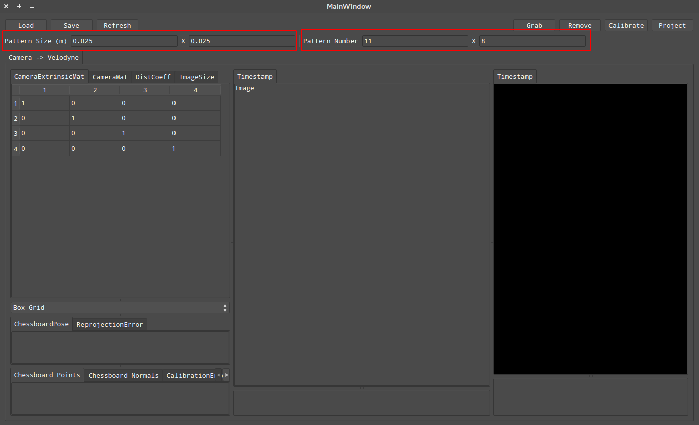 - Pattern Number:标定板长X宽的单元格数量 - 1,我的标定板是长有 12 个格子,宽有 9 个,所以填 11x8,减一是因为标定检测的是内部角点