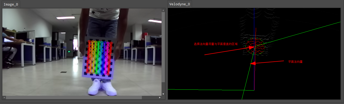 然后把鼠标放到右下角捕获的点云窗口,选择一个棋盘格的中心位置区域,关于这个区域的选择,我是参考这个标定工具的文档例子(文末有链接)选择的,大概就是标定板的中心位置选择一个圆形的区域,尽量保证向外侧的平面法向量垂直于标定板平面: