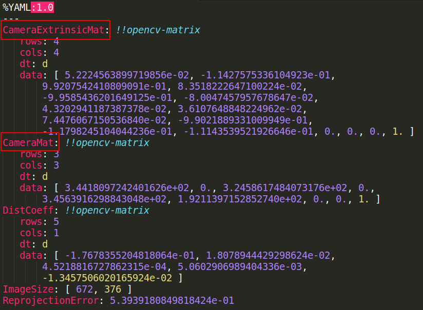 因此需要把前面的内参标定文件拷贝一份,修改格式为 yml 即可,YAML 和 YML 其实是一样的: