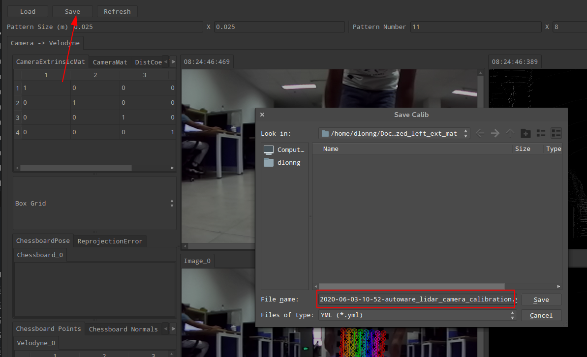 标定好之后,点击左上角「save」保存外参矩阵即可,文件名建议带上时间戳方便识别: