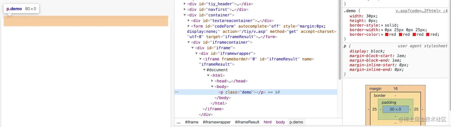- 强调标志:上边框宽为0,不和右边抢地盘,形成了右边的直角。右边框宽25px,下边框25px,右边框和下边框抢地盘,由于下边框是透明色,所以剩下了右边的三角形。