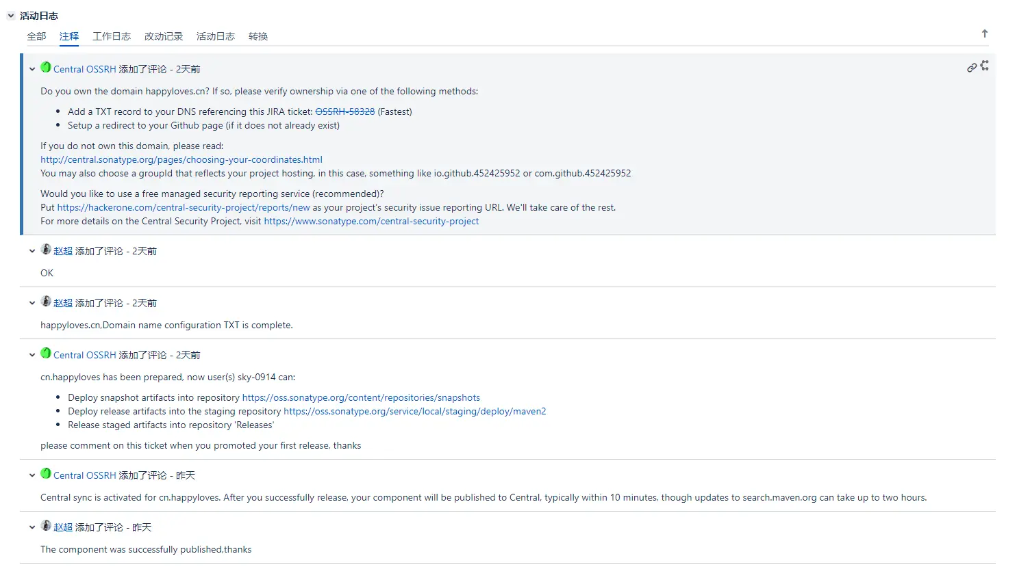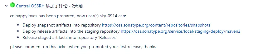 工作人员审核验证完之后会回复你,让你可以上传构建你的jar包了,当工单状态变为“已解决”,就可以上传maven项目了