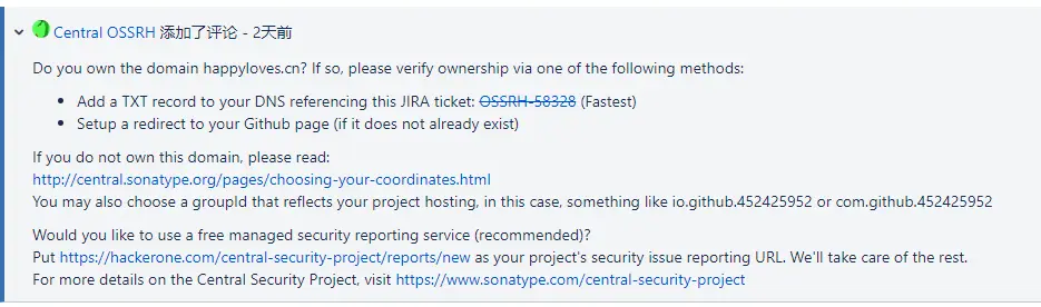 因为我这边用的是自己的域名,所以我需要为域名添加一个一个指向 Issue编号 的TXT记录(也就是你新建这个问题的地址:issues.sonatype.org/browse/OSSR…