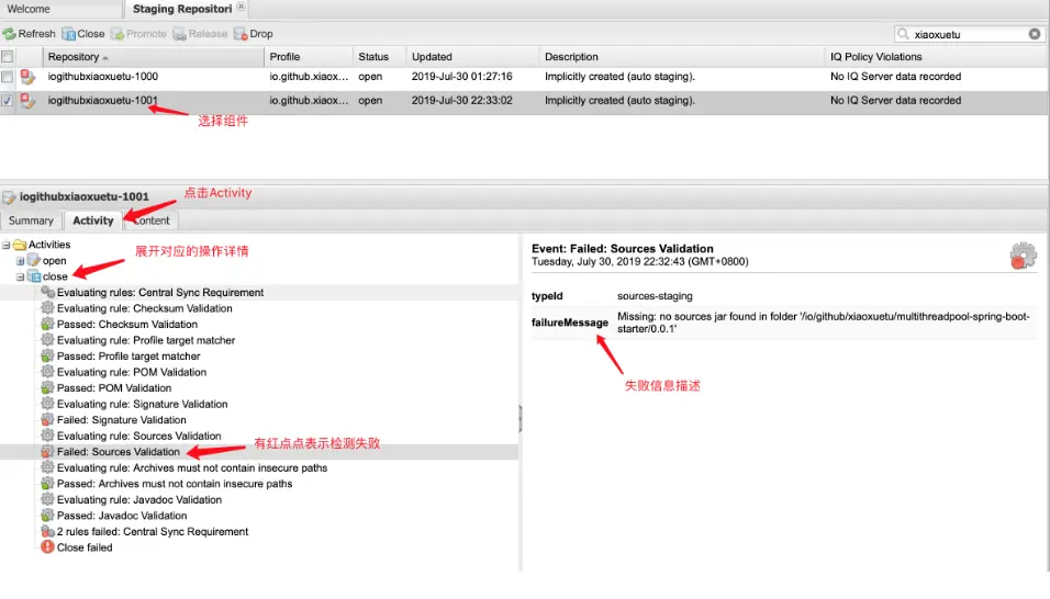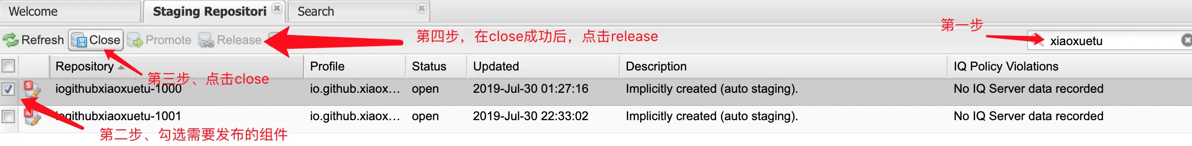 如果在pom文件中的 autoReleaseAfterClose的值没有设置的话,需要手动发布的组件,依次执行Close、Release操作