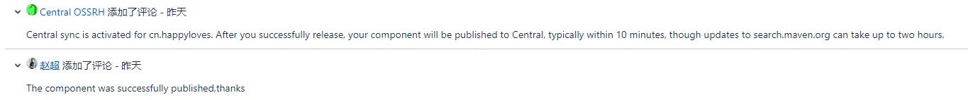 如果Release成功,并且你是首次发布组件,则需要到你创建到issue中回复 “我已经成功发布该组件”,经历大概2小时后,该组件将会同步到对应的maven仓库 。