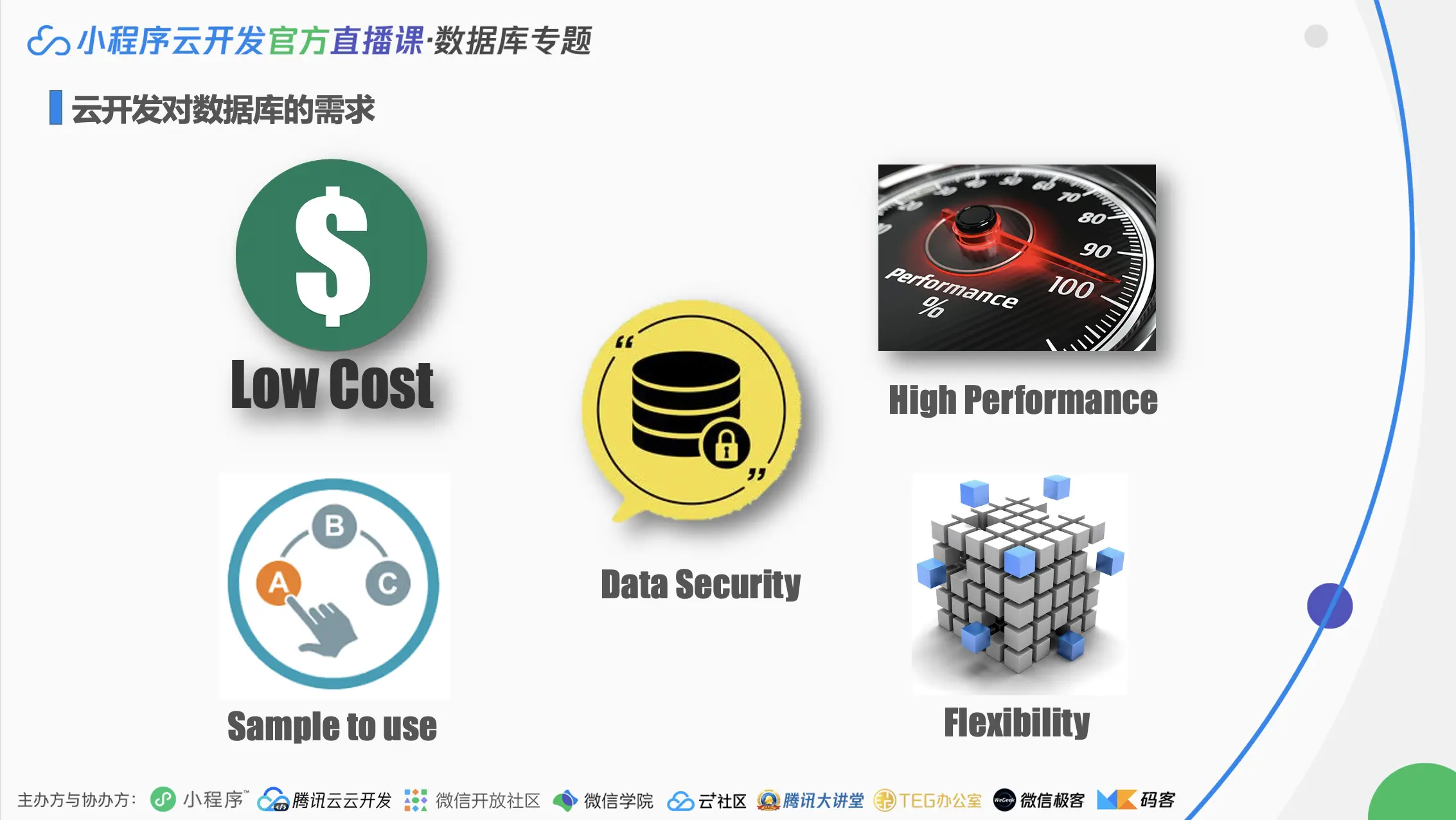 结语 在小程序场景下,云开发数据库围绕数据安全、易用性、低成本、高性能、灵活性5个主要场景需求,进行了相应的改造及优化,使得数据库可以更加贴合小程序的使用场景。