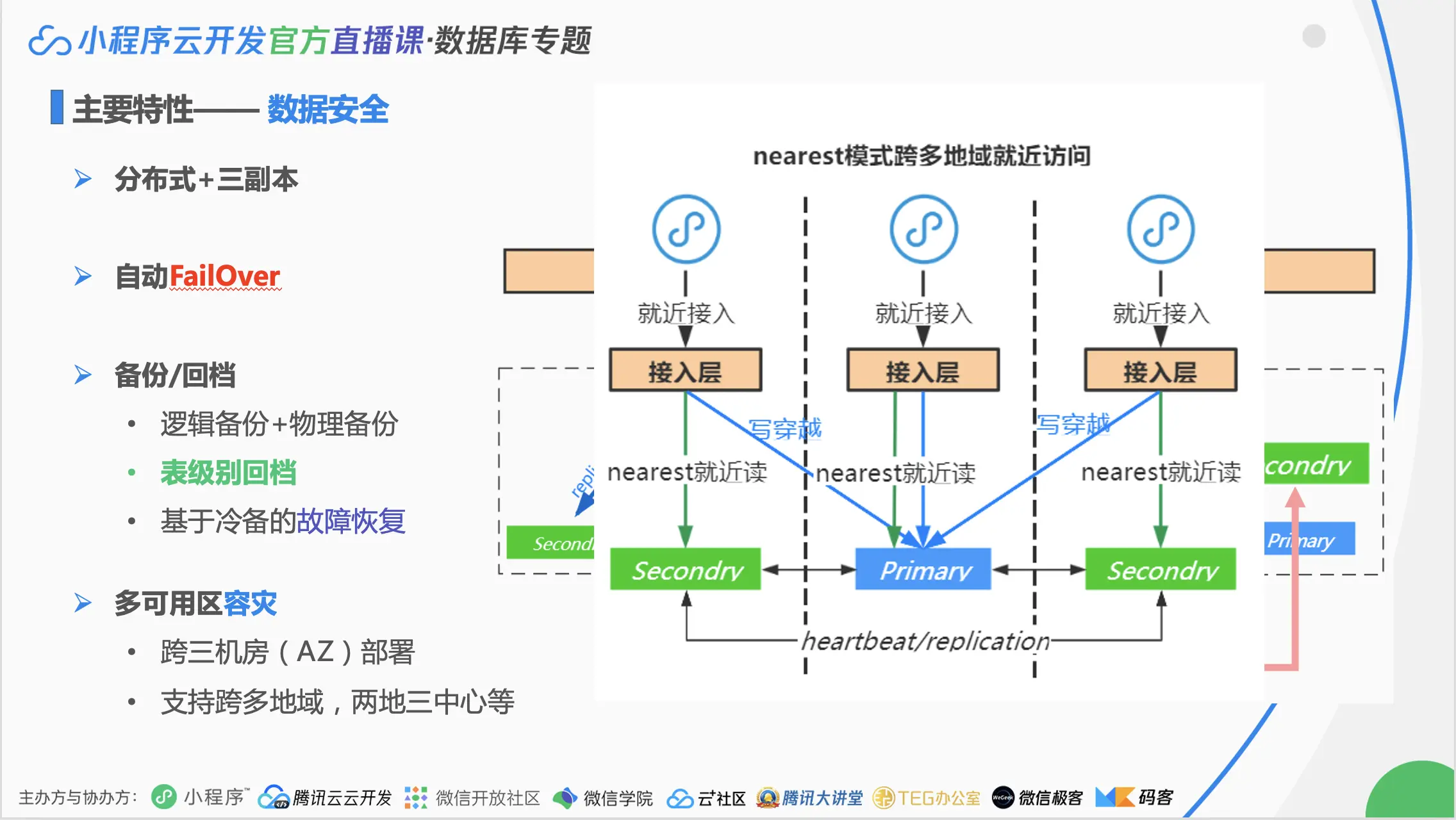 1)分布式多副本容灾。云开发数据库底层默认三副本,即一份数据会存储三份放在不同的机器上。节点区分主从状态,主节点可写可读,从节点只读。存储节点之间采用raft-like的副本集协议来实现三副本数据的最终一致性。另外,所有到数据库的连接必须认证以及所有数据均加密压缩存储这两点保证了数据的链路安全以及存储安全。