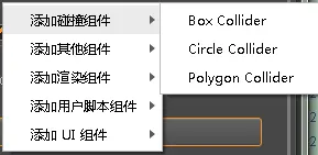 首先来看碰撞组件。CocosCreator提供了三种碰撞组件:Box Collider,Circle Collider,Polygon Collider。增添十分简单,只需要选中节点在属性检查器中选择添加组件。