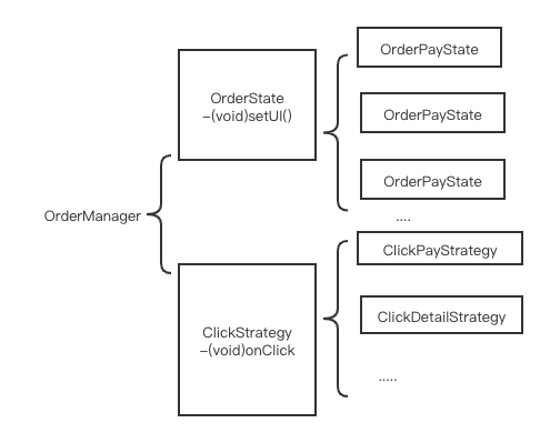 不同的状态显示不同的不同的UI,这种很容易让人想到状态模式,对于不同的点击事件则可以采用类似的策略模式,两者很相像,我的理解是状态模式是反应向的,策略模式是目的向的,可以自由组合的。