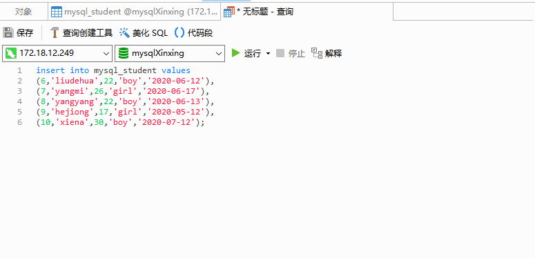 (1,'xinxing',22,'boy','2020-06-12'),